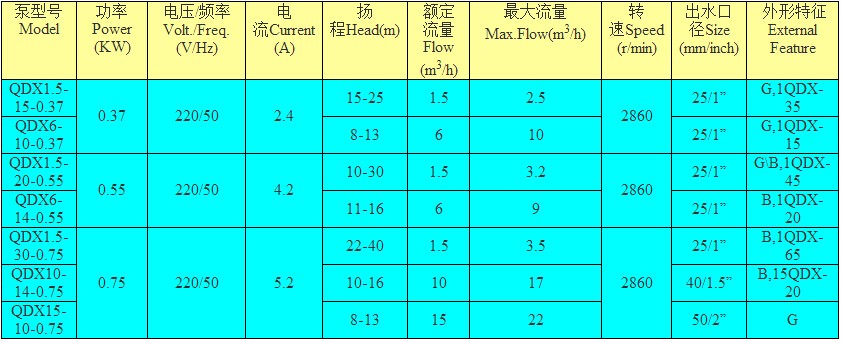产品详情:凌霄QDX型泵是一台下行泵潜水泵,机架为铝合金,两级机器密封,单相电机装有热保护器。电动泵简便结实。是完美的移动式抽水装置。适用于抽水温度≤40℃的净水。